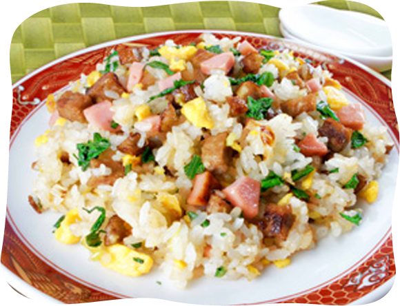 ハンバーグ「茶色」、ソーセージの「ピンク」、春菊の「緑」、卵の「黄色」 彩りチャーハン